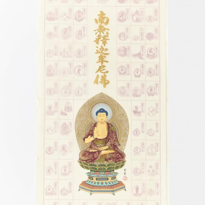 <南無釈迦牟尼佛>は、禅宗で用い、釈迦に帰依するの意。「釈迦」は姓で「牟尼」は名前、お釈迦様の名前である。「南無」は帰依礼拝するの意。